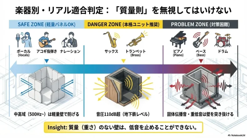 遮音効果の限界と楽器別の適合度