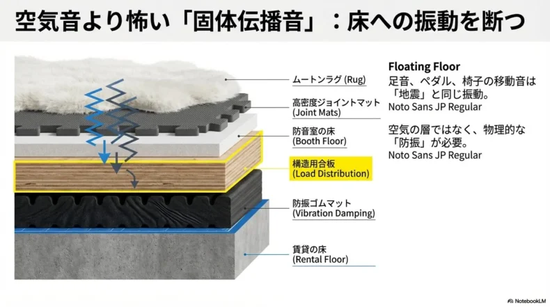 これを防ぐには、防音室自体の脚に「防振マット」を敷くだけでなく、内部の床にも厚さ10mm以上の高密度ジョイントマットを敷き詰める必要があります。