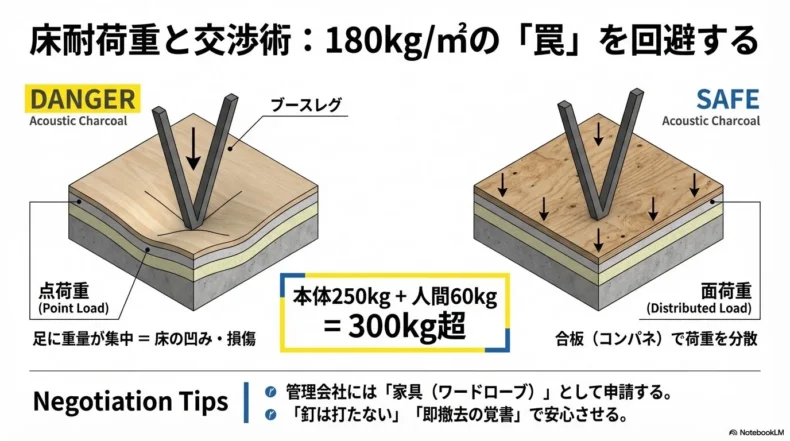 - 設置の落とし穴:賃貸の床耐荷重(180kg/㎡)を超えないよう、合板(コンパネ)で荷重を分散させるのが鉄則。