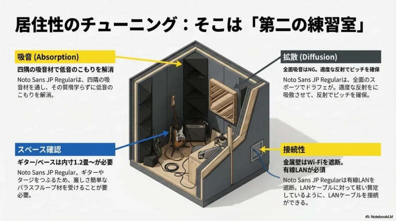 湿気に弱いため、梅雨時は除湿剤が必須です。また、アコースティック楽器の本格練習には、遮音性能が不足しているため、後述する吸音材や遮音シートの追加貼り付け(デッドニング)が不可欠となります。