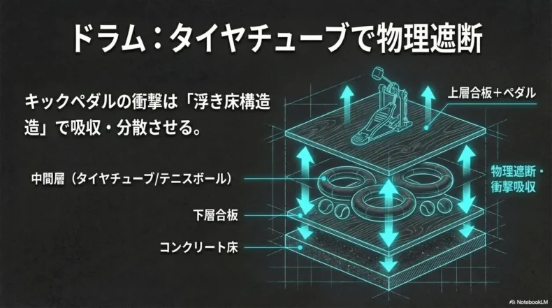 楽器店で推奨される市販の薄いゴム製防音マットを数枚重ねて敷いただけでは、大人が全力で踏み込むキックの巨大なエネルギーを到底殺しきれず、ほぼ確実に階下の住人からの激しい苦情や、管理会社からの警告文投函に繋がってしまうそうです。