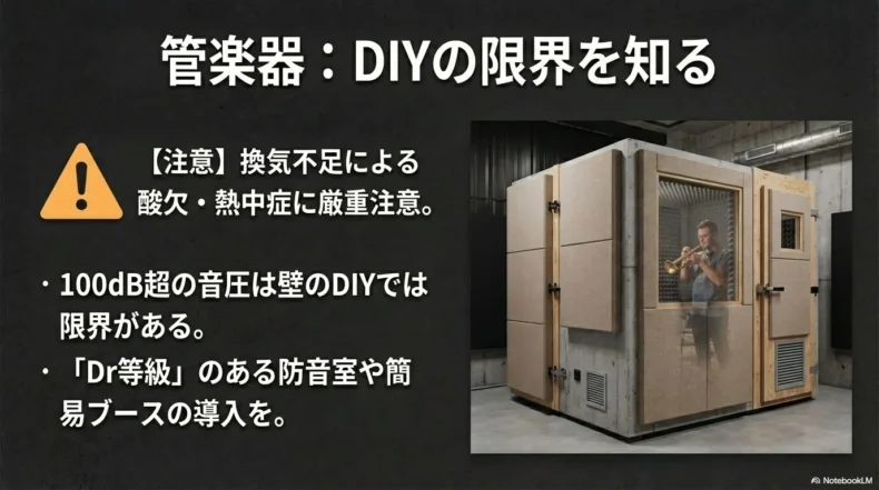声楽(オペラやベルカント唱法)を全力で練習する方も同様ですが、人間の体や金属の管から直線的に放たれる生音のエネルギーは、素人のDIYで作った壁では到底抑え込むことができません。