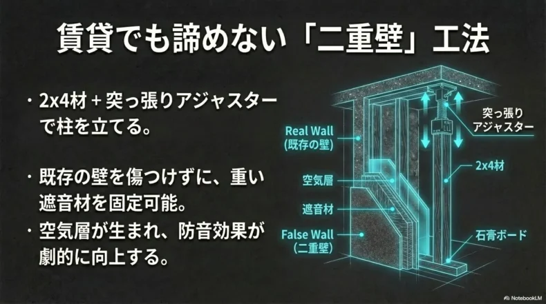 既存の壁の前にこの柱を数本立て、そこに重い遮音シートと吸音材を仕込んだ石膏ボードなどを打ち付けて張ることで、元の壁と新しい壁の間に数センチの「空気層」が生まれます