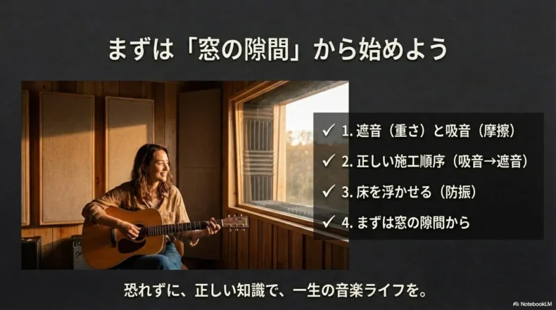 • 施工の順番は「楽器→吸音材→遮音材→壁」が絶対ルール。間違えると効果が激減します。