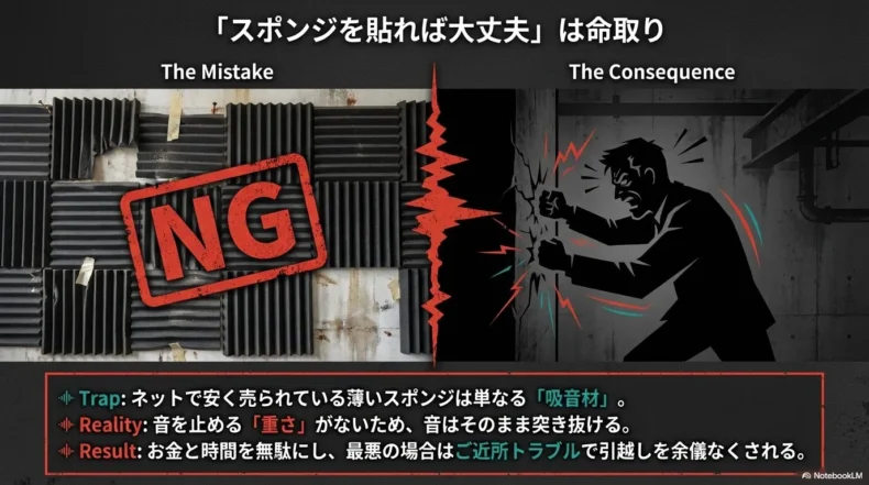 この基本概念を混同してしまうと、どんなに高価な機材や材料をホームセンターで大量に買い込んでも、音漏れが全く防げないという致命的なリスクを背負うことになります。