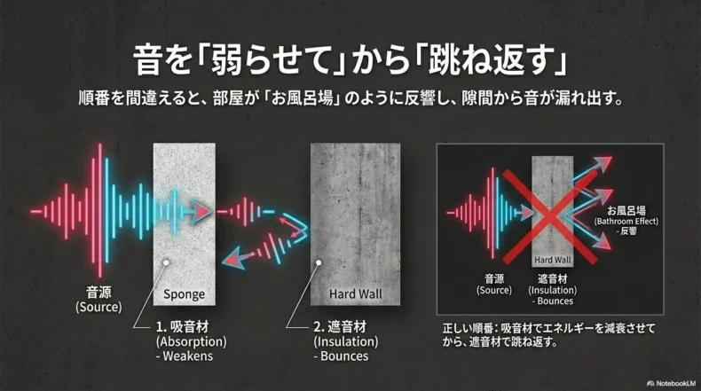 3. 跳ね返された音は、再び手前の「吸音材」を通過して部屋に戻るため、さらにエネルギーが奪われます。結果として外への漏れも、室内での反響も最小限に抑えられます。