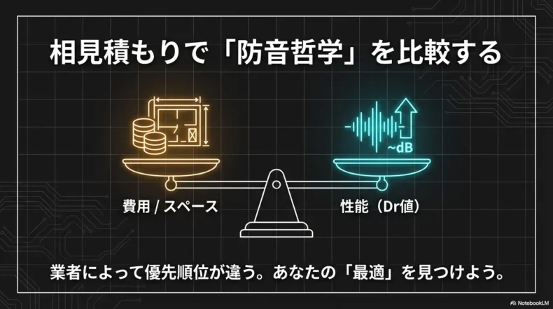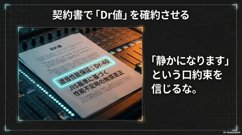 それは、ただ一つ。「施工後の遮音性能(Dr値)を契約書に明記し、数値で保証できるか」という、この一点に尽きます。