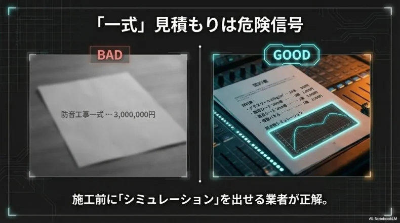 「防音工事 一式 100万円」といった大雑把な見積もりを出す業者は、材料の量や質をごまかそうとしている危険信号です。