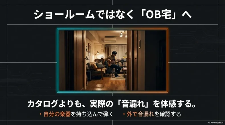 見学の際は、遠慮せずに「防音室の中で楽器を全力で演奏してもらい、自分は外の部屋や廊下で聞いてみる」という実験をさせてもらってください。自分が普段弾いているベースの最も低い開放弦の音や、スラップの衝撃音がどう聞こえるか。自分の耳と体で直接感じ取ったリアルな感覚こそが、取り返しのつかない後悔を防ぐ最後の砦になります。