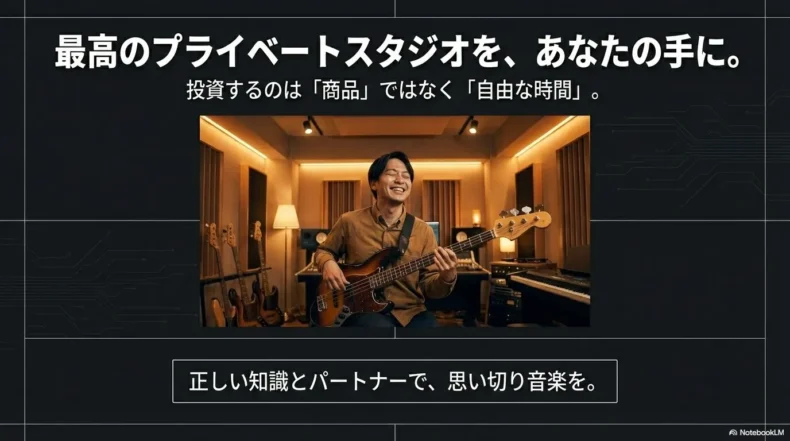 「自宅で時間を気にせず、思いっきりベースを鳴らしたい」「夜中でもピアノの練習に没頭したい」。音楽を愛する私たちにとって、自宅のスタジオ化はまさに人生最大の夢ですよね。でも現実は、仕事から帰ってきてふと浮かんだフレーズをその場で弾けないもどかしさや、スタジオの空きがなくてため息をつく日々の連続かなと思います。