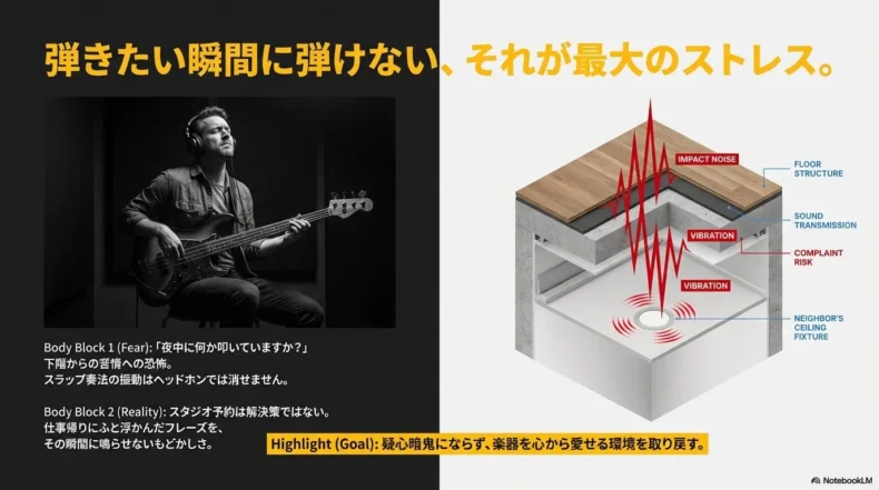 私自身、音楽高校を卒業してからずっとベースを弾き続けてきましたが、賃貸マンション時代は本当に苦労しました。ヘッドホンをしていても、スラップ奏法をした時の「ベンッ!」という弦の振動が床を伝わり、下階の方から「夜中に何か叩いていませんか?」とやんわりクレームを頂いた時の、あの血の気が引くような感覚は二度と味わいたくありません。エレベーターで住人とすれ違うたびに「うるさいと思われているんじゃないか」と疑心暗鬼になり、大好きな楽器が少し怖くなってしまった時期さえありました。あの時、「もっと早く正しい知識を持っていれば」と何度思ったことか。