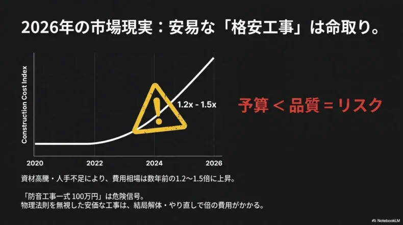 2026年現在、世界的な建築資材の高騰(ウッドショック以降の高止まりや、円安による輸入資材の値上がり)と、建設業界の深刻な人手不足による人件費の上昇により、防音リフォームの費用は数年前に比べて約1.2倍〜1.5倍に上昇しています。特に防音工事には、鉛シートや高比重の遮音パネル、特殊な防振ゴムなど、一般的なリフォームでは使わない高価な部材が大量に必要となるため、市場価格の変動をダイレクトに受けやすいのです。