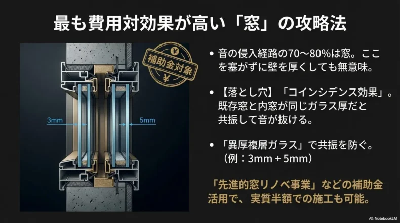 もしあなたが「予算は限られているが、まずは手軽に効果を出したい」と考えているなら、迷わず「窓」のリフォームから始めてください。なぜなら、鉄筋コンクリート造のマンションであっても、建物の中で最も壁が薄く(ガラス一枚の厚さはわずか3mm〜5mm)、隙間が多いのが窓であり、音の侵入・流出経路の約70%〜80%は「窓」などの開口部だと言われているからです。壁をいくら厚くしても、窓がそのままであれば、穴の開いたバケツで水を汲むようなものです。