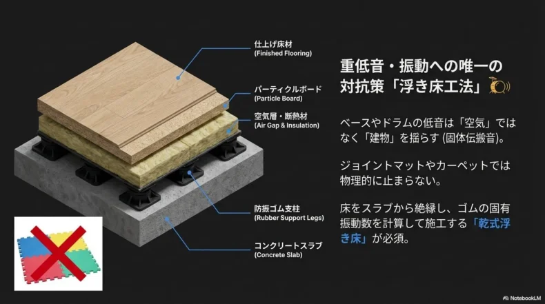 本格的な対策には、床を一度解体し、防振ゴムや高性能グラスウールを入れて床全体を躯体から完全に浮かせる「浮き床(うきゆか)工法」が必須となります。これは、コンクリートスラブ(建物の床)の上に、ゴムやスプリングで支持された「もう一つの床」を作るようなイメージで、振動の伝達経路を物理的に遮断(絶縁)する唯一の方法です。