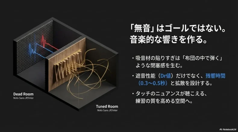 よくある失敗例として、防音性能を気にするあまり、部屋中の壁や天井に吸音材(スポンジや有孔ボード、グラスウール)を貼りすぎてしまうケースがあります。こうなると、音が全く響かない、いわゆる「デッド」な空間になり、まるで布団の中で弾いているような閉塞感に襲われます。これでは、自分の出した音のニュアンス、倍音の広がり、強弱の微妙な変化が耳に届かず、演奏していて非常に疲れますし、表現力を養う練習になりません。私の知り合いのピアノ講師も、「デッドすぎる部屋で練習している生徒は、ホールで弾いた時に音が飛ばない(タッチが弱くなる)」と嘆いていました。