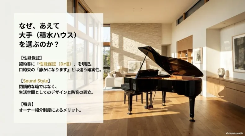 ここで、数ある選択肢の一つとして、私が個人的に注目している大手ハウスメーカーの防音リフォームについて触れておきます。特に「積水ハウス(積水ハウス建設)」のリフォームは、単なる「防音室(箱)」を作るのではなく、「音のある暮らし(Sound Style)」というライフスタイルそのものを提案している点で、他の専門業者とは一線を画しています。