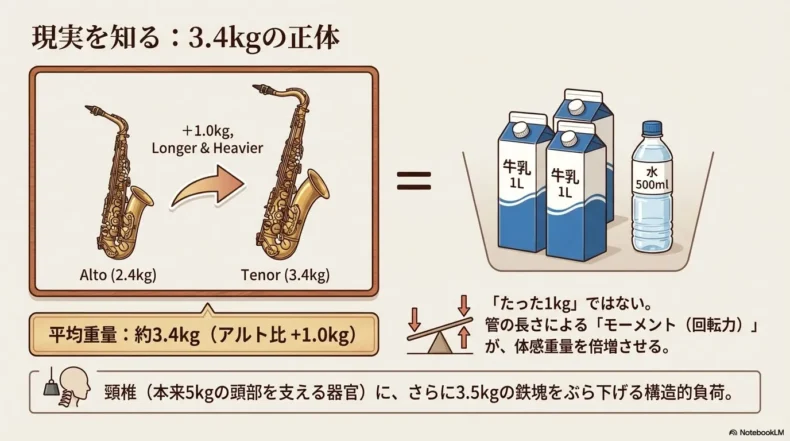 • テナーサックスの平均重量は約3.4kg。アルトより約1kg重く、首への負担対策が必須。