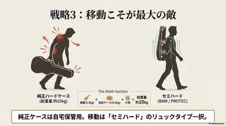 前述の通り、純正のハードケースでの移動は苦行そのものです。移動の負担を減らし、スタジオに着いた時点で体力を温存しておくためには、ケースの買い替えが必須事項となります。しかし、ここで注意していただきたいのが、「軽ければ何でも良い」というわけではないという点です。