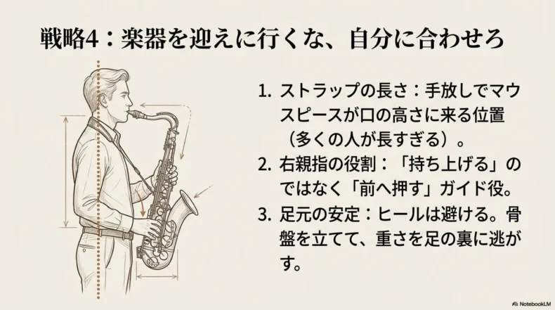 このセッティングが決まると、楽器の重量(下向きの力)はほぼ全てストラップを経由して首や肩にかかり、腕や手首は楽器の重量から解放されて自由になります。これにより、指の力が抜け、速いパッセージもスムーズに吹けるようになります。「楽器が軽く感じる」というのは、物理的に重量が減るわけではなく、「無駄な筋力を使わずに、骨格で効率的に支えられている状態」のことを指すのです。