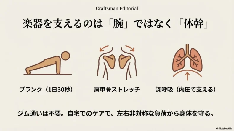 重要なのは、アウターマッスル(表面の筋肉)でガチガチに固めるのではなく、「腕力で持つ」意識を捨てて、「骨格と体幹で支える」感覚を養うことです。この意識を持つだけで、3.5kgの鉄の塊は驚くほど軽く感じられるようになります。楽器の練習だけでなく、自分の身体のメンテナンスにも少しだけ目を向けてみてください。それが、長く楽しく楽器を続けるための土台となります。