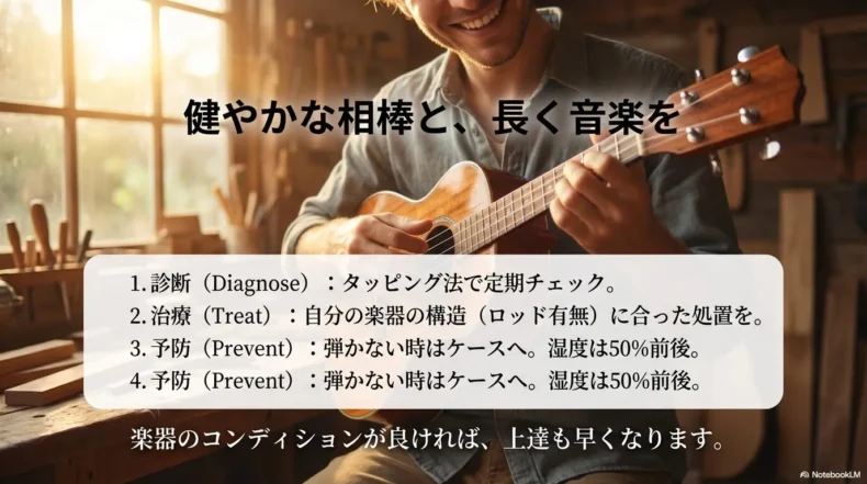 ウクレレのネック反りは、木製楽器である以上避けては通れない問題です。しかし、日々のちょっとした気遣いと正しい知識があれば、重症化を防ぐことは十分に可能です。
