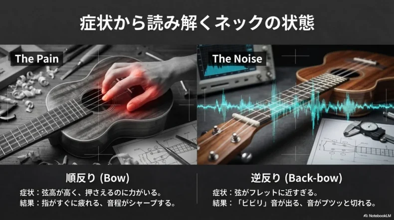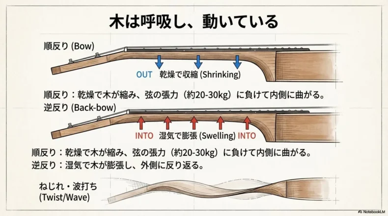 • ネック反りの正体:湿気や乾燥で木が動き、弦高が高くなる「順反り」や、ビビリが出る「逆反り」が発生する。