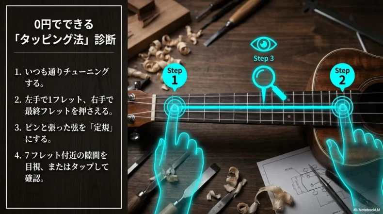 • 0円診断法:1フレットと最終フレットを押さえ、中間の隙間を見る「タッピング法」なら誰でも正確に分かる。