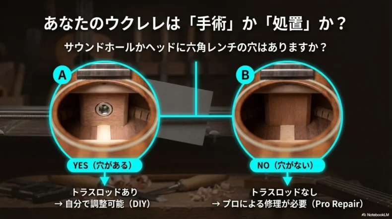 • 修理の分かれ道:トラスロッドがあれば自分で直せるが、ない場合は「ネックアイロン」などプロの修理が必要。