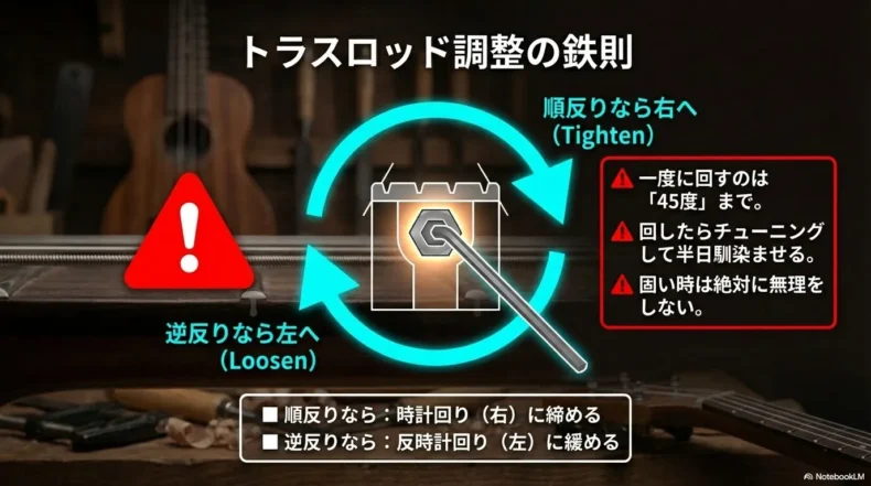 ここで一番大切なのは、一度に回すのは45度(1/8回転)程度までにするということです。一気にグイッと半回転も回すと、中の木がミシミシと割れたり(指板割れ)、ロッド自体がねじ切れたりする事故が起きます。少し回したらチューニングして確認し、半日置いて木が馴染むのを待つくらいの慎重さが必要です。