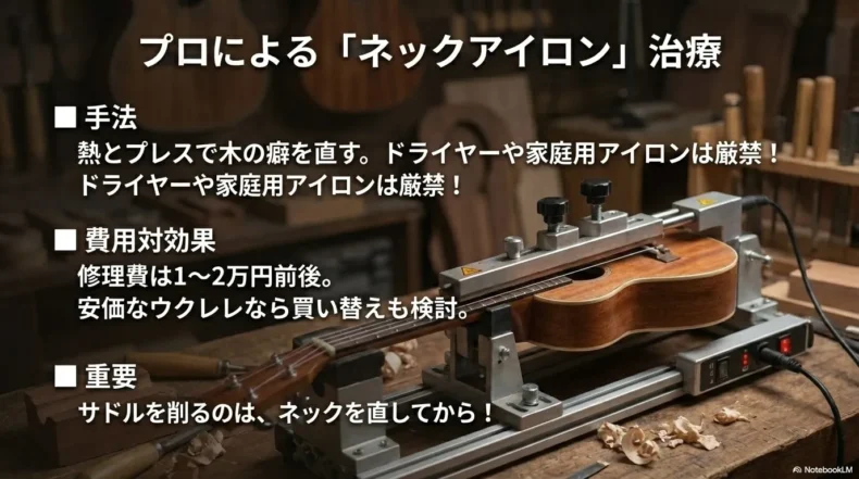 ではどうするか。プロのリペアショップでは、こうした場合に「ネックアイロン(ヒーター修正)」という修理を行います。これは物理的な手術に近いアプローチです。