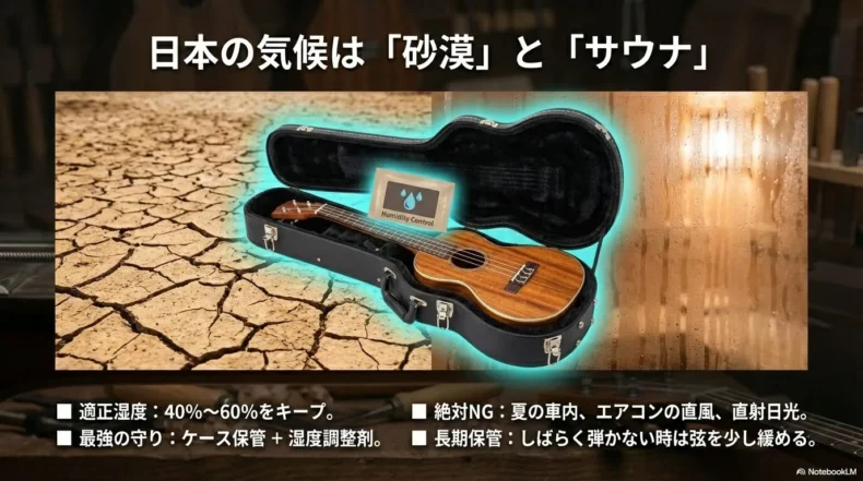 「せっかく買ったウクレレなんだから、部屋に飾っておきたい!」という気持ちも痛いほど分かります。しかし、日本の四季(特に梅雨と冬)は、剥き出しの楽器にはあまりにも過酷です。弾かない時はケースにしまう。これだけでネックトラブルの8割は防げると言っても過言ではありません。私は「ケースから出す=演奏の儀式」と考えて楽しんでいます。
