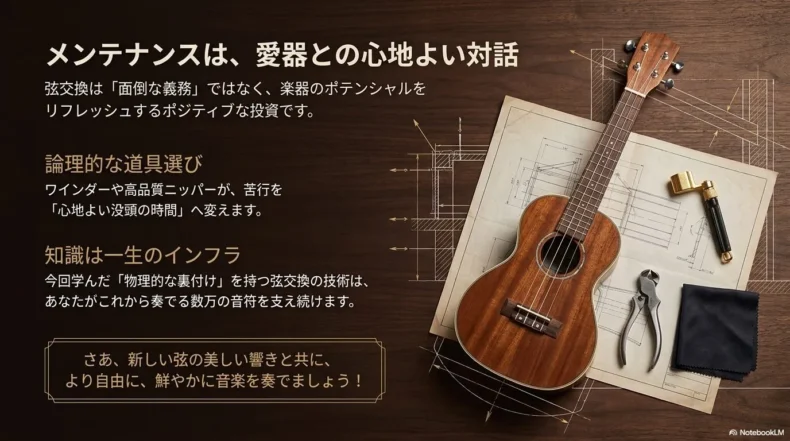 「誠実な余裕」を持つこと。これが、楽器トラブルを未然に防ぎ、一生の趣味としてウクレレを楽しむための知恵ですね。