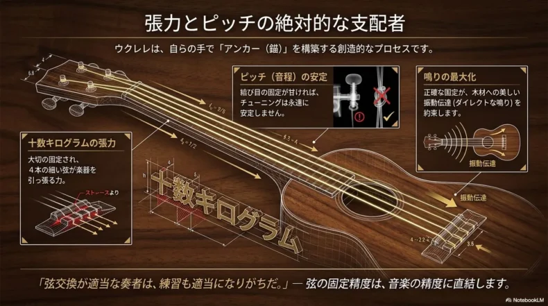 特にウクレレという楽器は、その可愛らしい外見とは裏腹に、弦の固定に独特の「知恵」と「物理的なロジック」を要求してきます。
