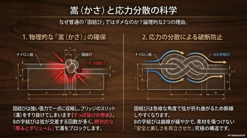 固結びは弦が急峻な角度で折れ曲がるため、そこから破断(弦切れ)しやすくなりますが、8の字結びは曲線が緩やかで、素材を痛めにくい構造をしています。