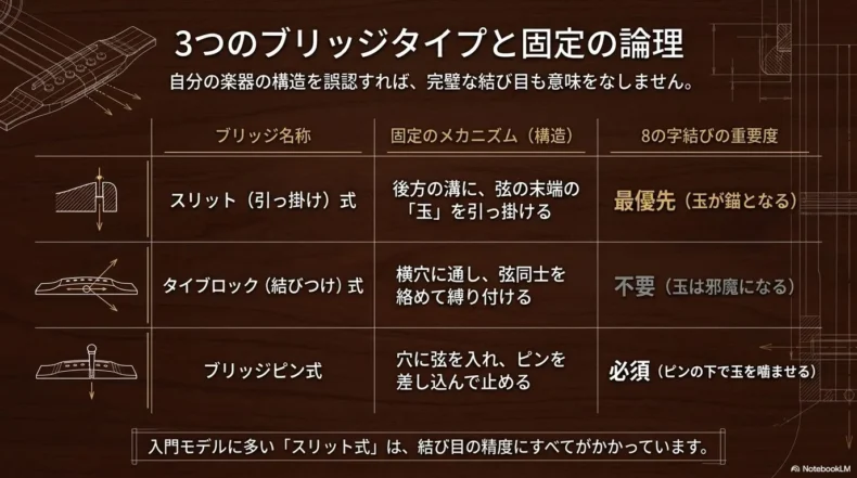 私が音楽高校時代の友人たちに聞いたところ、「自分の楽器のブリッジタイプを誤認していると、どれだけ完璧な8の字結びをしても意味をなさない」という非常に重要なアドバイスをもらいました。