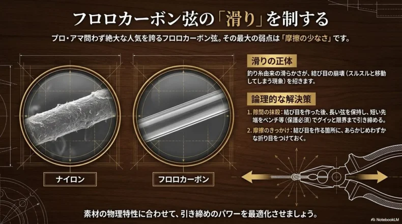 特に表面が滑らかなフロロカーボン弦や、極細の1弦を使っている場合、通常の8の字一回では素材の物理的な限界を超えてしまうことがあります。