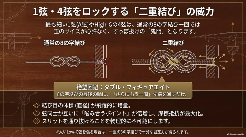 これらの弦は物理的に極めて細く、通常の8の字結び一回だけでは、ストッパーとしての「玉」の直径が心許ないサイズになってしまいます。