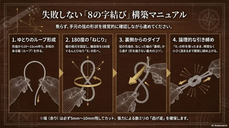そこで今回は、同じ音楽を愛するアマチュアの視点に立ち、論理的かつ効率的に、ウクレレの弦の結び方として絶対的な信頼を誇る「8の字結び」を徹底的に深掘りしていきます。