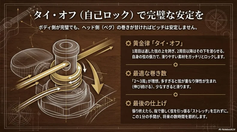 ボディ側の固定が完璧になっても、まだ記事は終わりません。最後の砦は、ヘッド側(ペグ)での「巻き」の精度です。