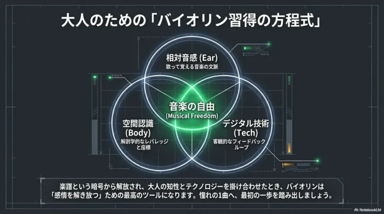 大人がこの域に達するには、まずは「音名」という言葉を捨てる勇気が必要です。音楽理論に明るい人ほど「これは第3音だから…」と考えがちですが、バイオリンにおいては「視覚」と「触覚」をダイレクトに結びつける練習が、脳の負担を減らす最強の処方箋となります。