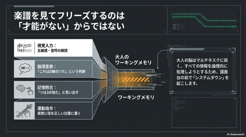 大人の脳は、視覚情報を論理的に処理しようとする能力が発達しすぎています。そのため、五線譜上の「音の高さ」、音符の形による「リズム」、さらには「強弱記号」や「運指番号」など、すべての情報を等しく完璧に処理しようとして、脳のワーキングメモリがパンクしてしまうんですね。