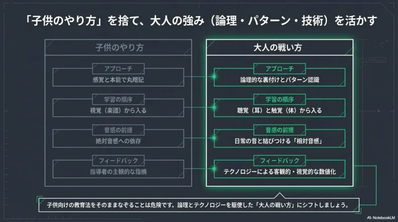 大人が新しい楽器、特にフレットのないバイオリンに挑戦する場合、従来の「子供向けの教育法」をそのままなぞるのは非常に危険です。