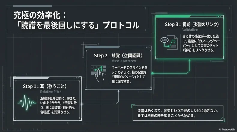 音符という抽象的な記号を、歌、指の形、日常の音といった「具体的な情報」と紐付けることで、譜読みのスピードは飛躍的に向上します。