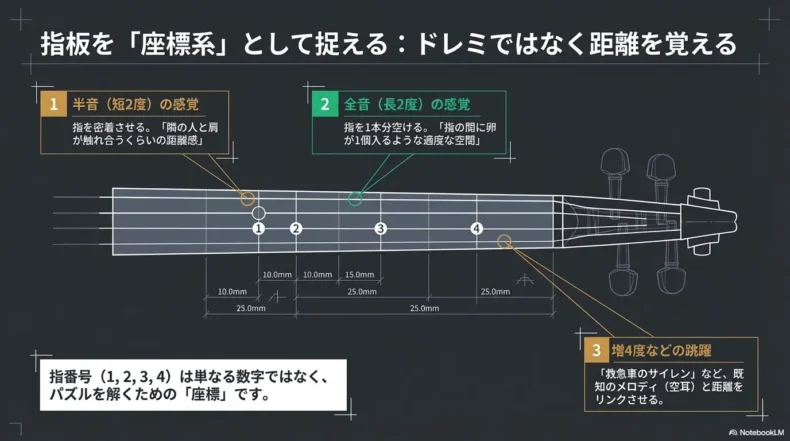 しかし、これも論理的に分解すれば攻略可能です。指番号「1、2、3、4」は、単なる数字ではなく、バイオリンというパズルを解くための「座標」だと考えてください。私がベースを弾く際も、常に「ルート音から何フレット離れているか」という座標で指を動かしています。バイオリンにおける指番号も、それと同じ役割を果たします。