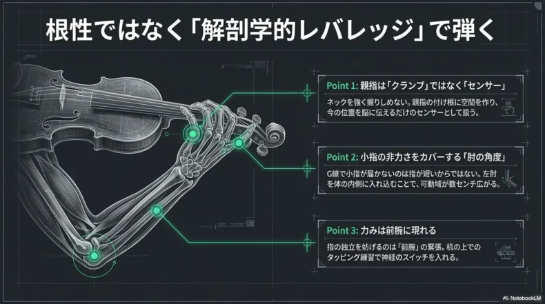 左手の自由度を決めるのは、実は「親指」です。音楽高校時代のバイオリン専攻の子たちは、よく「親指はただのセンサーだ」と言っていました。ネックを「持つ」ためではなく、今の手の位置がどこにあるかを脳に伝えるためのセンサーです。