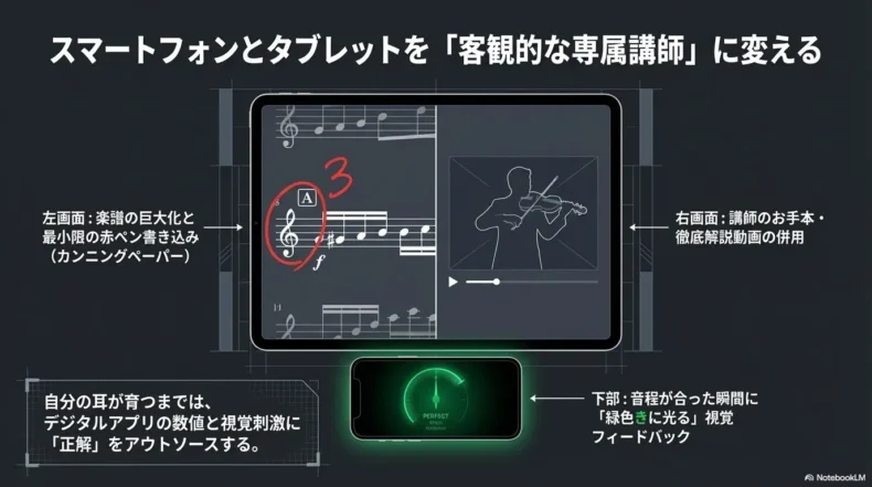 - デジタルツールの活用:タブレットでの楽譜拡大や、チューナーアプリによる音程の可視化が、独学の不安を論理的に解消する。