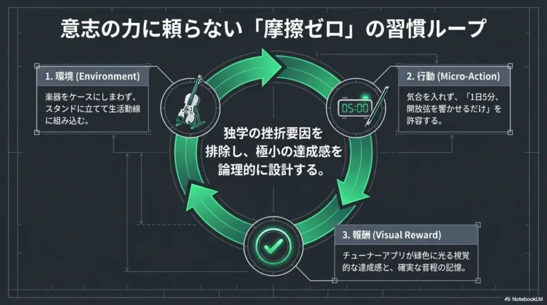 バイオリンを嗜む私の友人は、「今日はこの1小節だけを、チューナーを一度も赤くせずに弾く」という超ミニマムな目標を毎日設定しているそうです。大人の上達には、こうした「小さな達成感」を論理的に積み上げる自己管理能力が求められます。