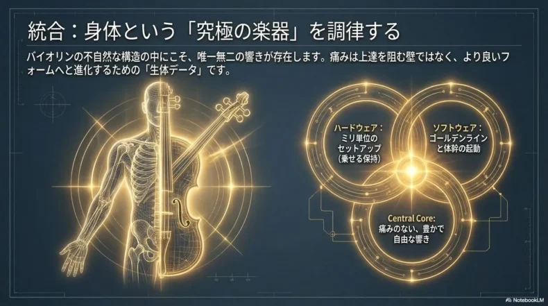 ここまで、バイオリンによる背中の痛みについて、その正体から具体的な解決策まで論理的に深掘りしてきました。バイオリンという楽器は、人間の身体構造にとっては非常に「わがまま」で、負担の大きい楽器です。