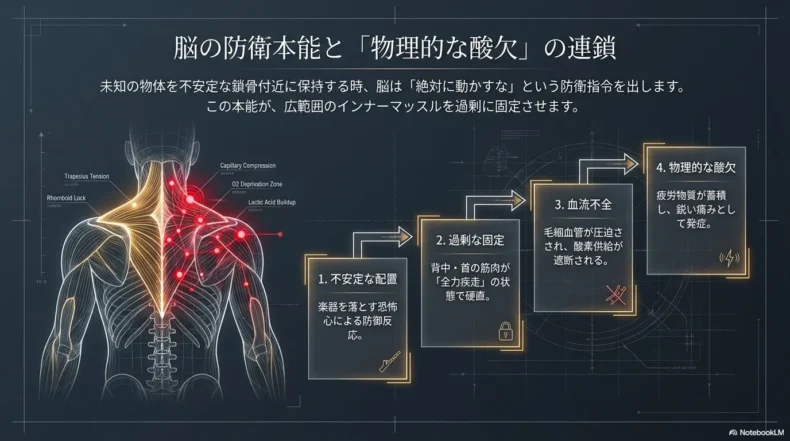 楽器を動かさないように固定しようとする力が、背中の僧帽筋や菱形筋を常に収縮させ、血流不全を引き起こします。これが痛みの正体です。