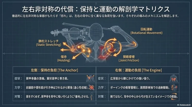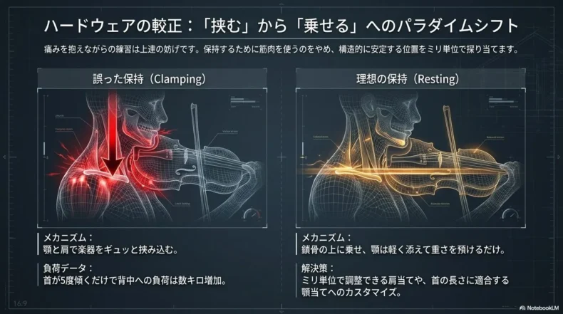 - 痛みの正体: 楽器保持への恐怖心による「過剰な固定」と、左右非対称な姿勢が招く血流不全。